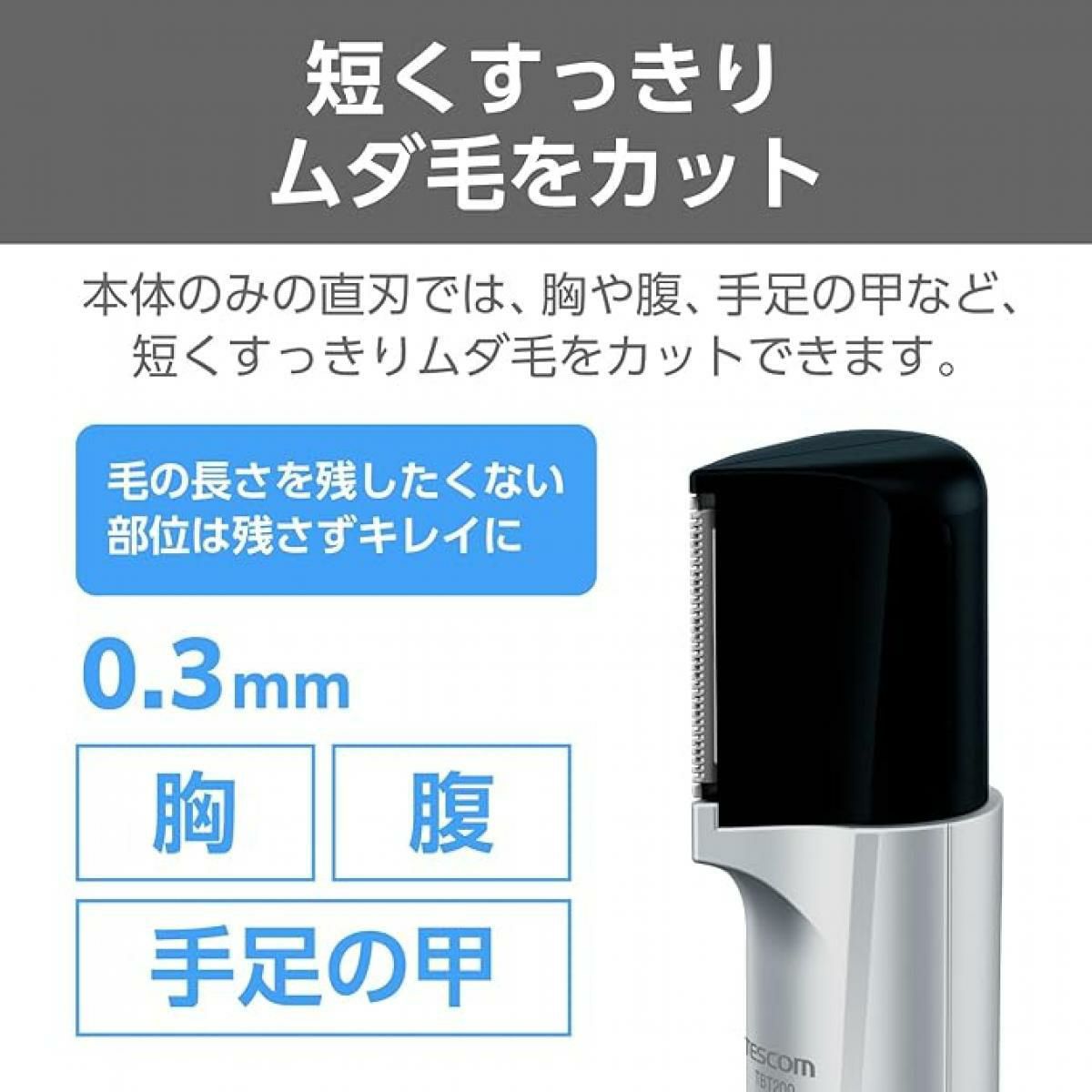 ■本体のみの直刃では、胸や腹、手足の甲など、短くすっきりムダ毛をカットできます。