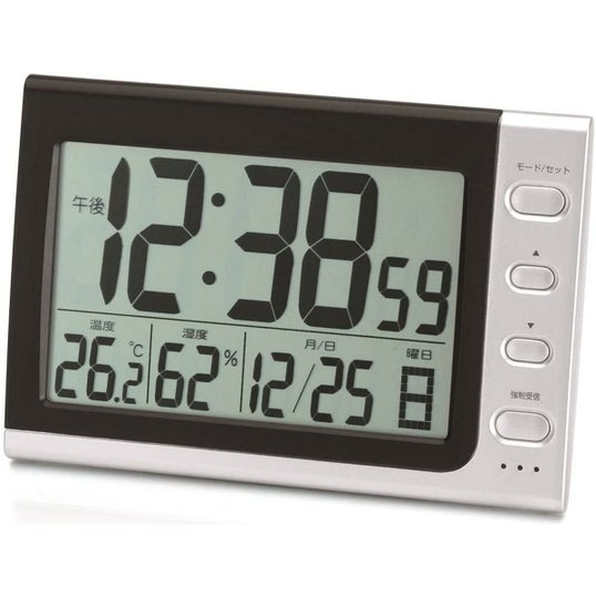 機能:電波受信機能(自動受信、手動受信)、電子音アラーム、スヌーズ機能、カレンダー表示、温度表示、湿度表示、バックライト