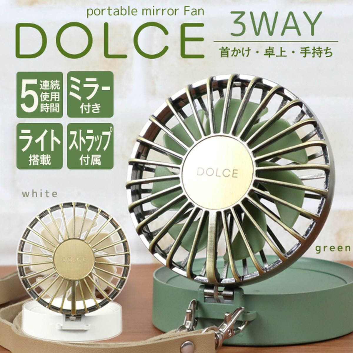 ポータブルミラーファン DOLCE グリーン 3WAY 首かけ 卓上 手持ち 手鏡 ライト搭載 ストラップ付属