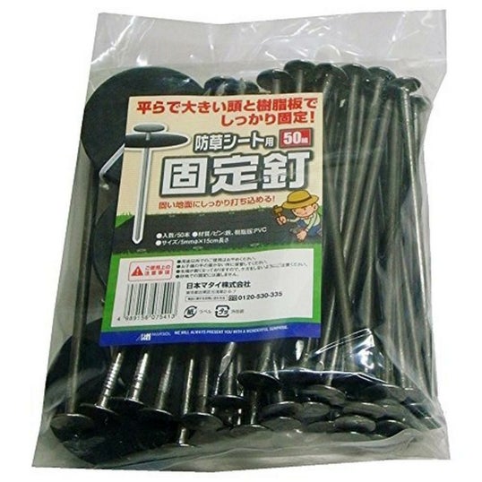 「日本マタイ 防草シート用固定釘 5mm×15cm 50本」は、平で大きい頭と樹脂板でしっかり固定できる雑草防止シート・グッズです。防草シートの固定用釘。