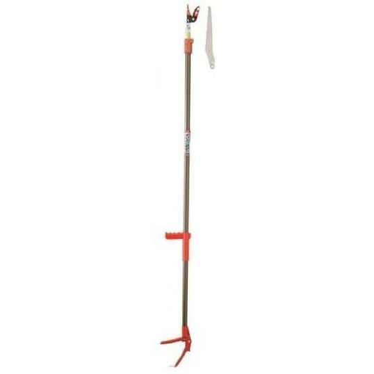 刃は取り外し可能なツカミ付きで葉刈りから採果まで幅広く使え、また、付属ののこぎりを先端に装着すれば太枝切りにも対応できます。