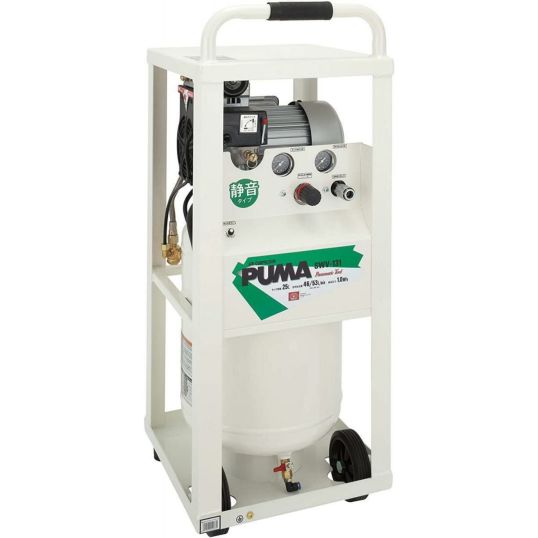 スリム形状で設置場所に困らない静音コンプレッサです。