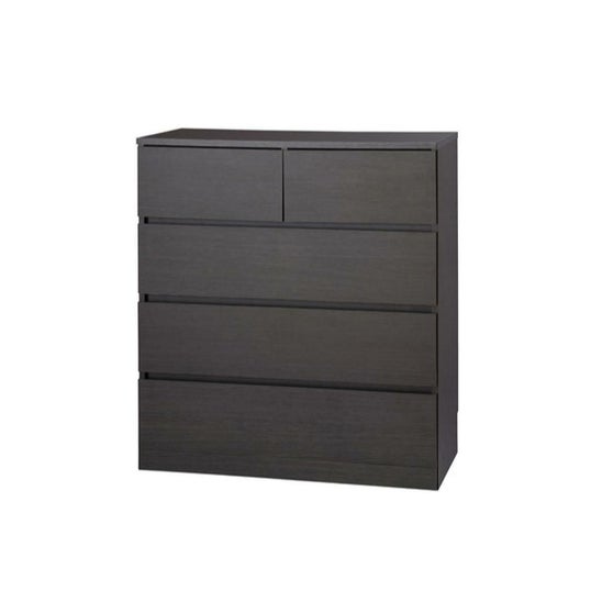 シンプルなデザインの木製チェストです。小引き出しが2個と大引き出しが3段のタイプです。引き出しには開閉がスムーズな金属レールを使用しています。引き出しの裏面には底抜け防止の補強板を付けることで、しっかり支えたっぷり収納することができます。背板には横揺れを防止する背板止め付きです。お客様組み立てとなります。組み立てパーツに番号シール付きです。