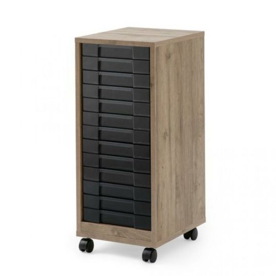 ウッド調のSOHOオフィスや家庭のインテリアにも良く合う木製のフロアケースです。デスク横での使用に最適な高さの浅型13段タイプです。キャスターが付いているので移動にとても便利です。