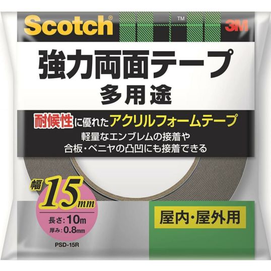 3M スコッチ 強力両面テープ 幅15mm 長さ10m PSD-15R 屋内・屋外用 アクリルフォームテープ 合板 ベニヤ 木材 強力接着 金属 ガラス
