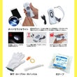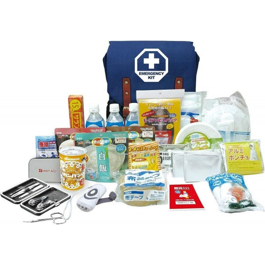リュック、ダイナモラジオライト、軍手、ホイッスル、ロープ3m、アルミポンチョ、非常用ブランケット、給水タンク3L、保存水500ml×3本、マジックライス×3食、カンパン、救急ポーチセット、グルーミングセット、食品加熱セット3回分、紙皿、サランラップ15m、布テープ、非常用スリーピングバッグ、携帯トイレ、レスキューシート、防災用ウェットティッシュ、コンパクトエアーマット、防災チェックリスト