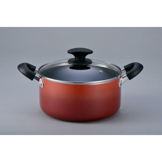 素材・材質:本体/アルミニウム (板厚2.2mm)、内面/ふっ素樹脂塗膜加工、外面/耐熱塗装 (グラデーション)、底面/ステンレス板圧着、取っ手・つまみ/フェノール樹脂、蓋/全面物理強化ガラス