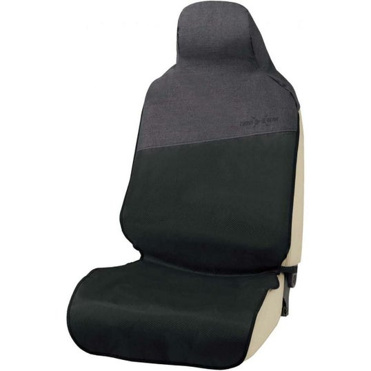 アウトドアスタイルをイメージした防水タイプのシートカバー。頭部に使用の杢調素材と背から座面にかけてのハニカム柄素材を組み合わせたツートンスタイル。水濡れやキズに強い素材でシートを汚れから守ります。 取付はヘッドレスト部のアタッチメントと、座面に掛ける2か所の平ゴムで使用時のズレをしっかり防止。丸洗いもできるので汚れても安心です。