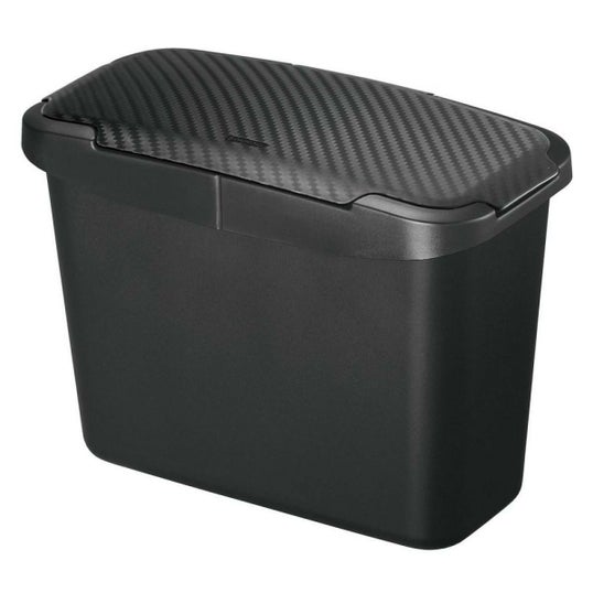 ゴミ箱本体には中身が見えないようにフタが付いています。フタは本体に対して約90度の位置で固定できるので、ゴミを捨てる度に開閉せずフタを開けたままでも使用できます。正面と両側面の3方向からフタが開けることができるので、運転席からでも助手席からでも開けやすい構造です.フタにはカーボン調のデザインが施され、車内をスポーティに演出します。