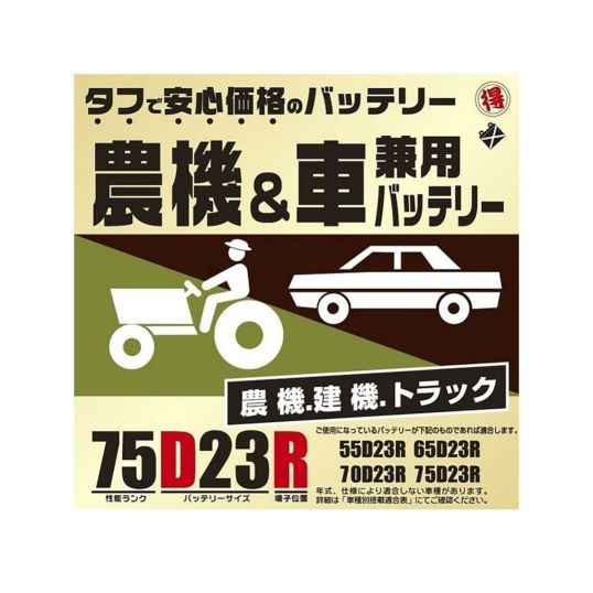 ◇農機・建機・トラック向きバッテリー!◇補水可能なキャップ式(埃でつまることなく、手入れしやすい凸キャップ) ◇インジケータ、収納取っ手付 ※B19~D31 ◇製品保証 12ヶ月または2万Km ●ご使用になっているバッテリーが下記のものであれば適合します。 26A19L 28A19L 30A19L