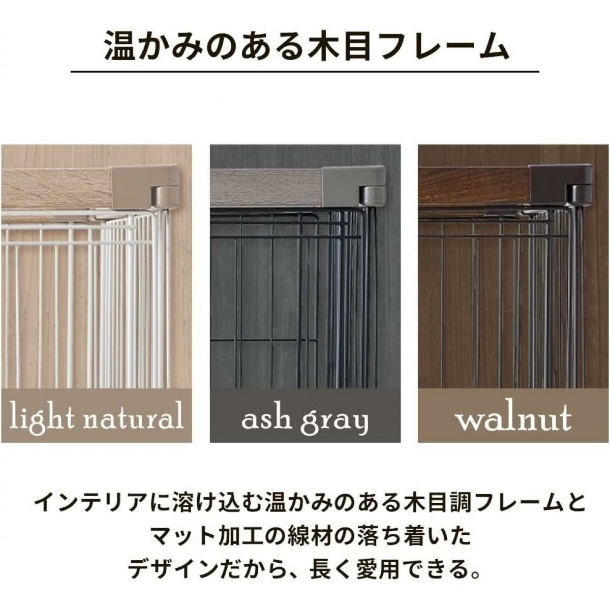 インテリアに合わせて3色から選べる木目調のウッディサークルです。インテリアに溶け込む温かみのある木目調なので、落ち着いたカラーで長く愛用できます。 ・スムーズな開閉ができるスライドドアは右側・左側どちら側にも設置可能です。 ・四隅にピンを差し込むだけで組み立て完了。 ・トレーは水拭きはもちろん、水で丸洗いできます。 ・幅・高さ・奥行が違う豊富なサイズバリエーション。わんちゃんの大きさや性格に合わせて選べます。 ・別売りの屋根を付けることで、留守番時などのペットの飛び出しを防止します。 ※お客様組み立て
