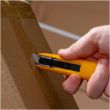切り終わると刃が自動で収納される、コンパクトで安心設計の開梱用カッター。左右両用。刃は前後2ヶ所使えます。