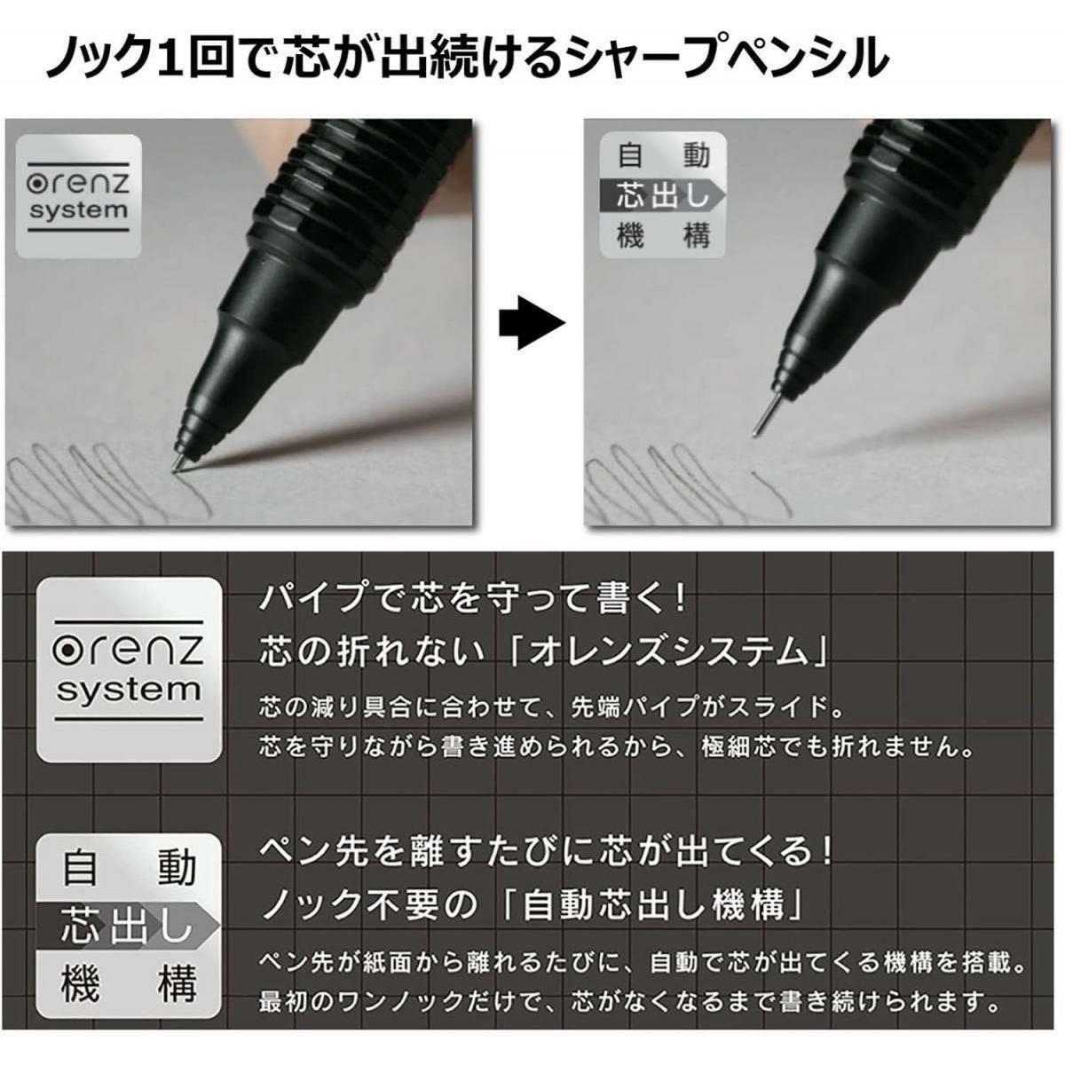 パイプで芯を守って書く!芯の折れない「オレンズシステム」と、ペン先を離すたびに芯が出てくる!ノック不要の「自動芯出し機構」を搭載。芯の減り具合に合わせて、先端パイプがスライドすることで、芯を守りながら書き進められるから、極細芯でも折れません。さらに、ペン先が紙面から離れるたびに、自動で芯が出てくる機構を搭載し、最初のワンノックだけで、残り芯が短くなるまで書き続けられます。